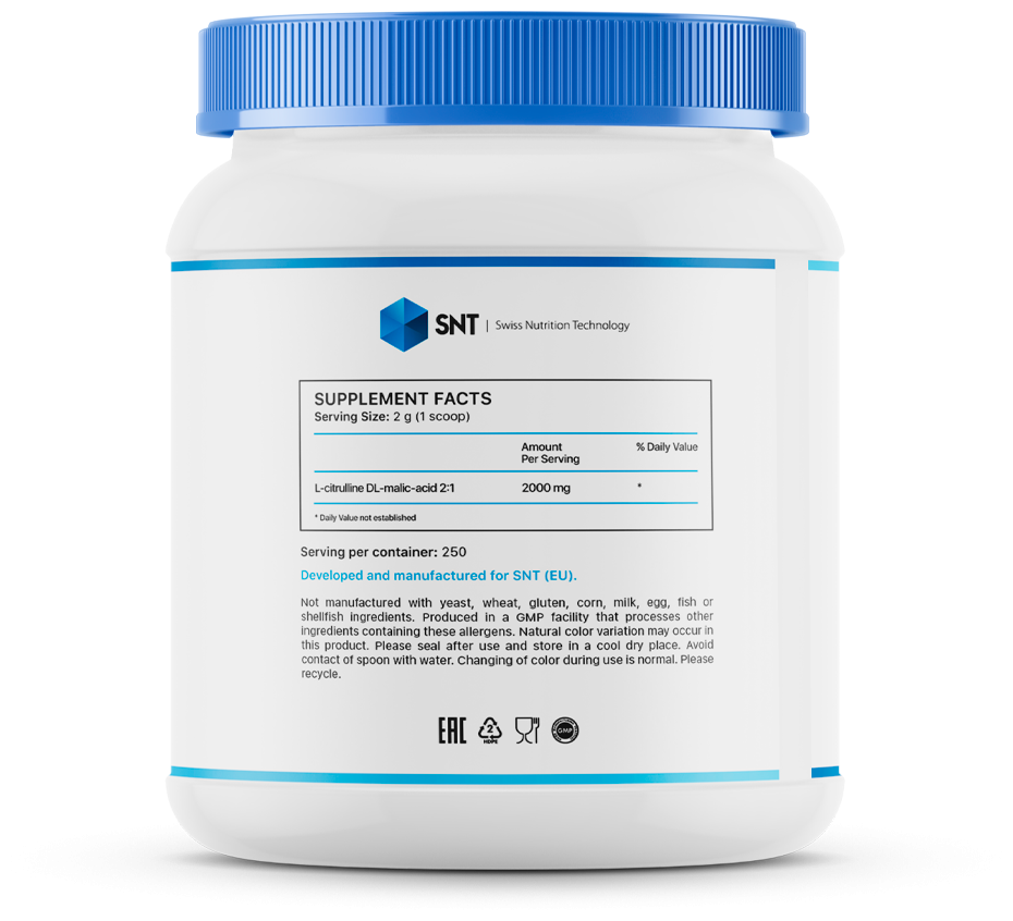• Улучшенный кровоток - Citrulline Malate может улучшить кровоток и доставку кислорода в мышцы. Это может помочь уменьшить мышечную боль и улучшить время восстановления после упражнений.