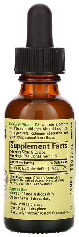 Витамин D3 от ChildLife разработан специально для младенцев и детей. Не содержит спирта, из натуральных ингредиентов, хорошо усваивается и имеет превосходный вкус натуральных ягод. Без глютена, спирта, и казеина. Полезные свойства витамина D, среди которых поддержка здоровья костей и иммунной системы.
