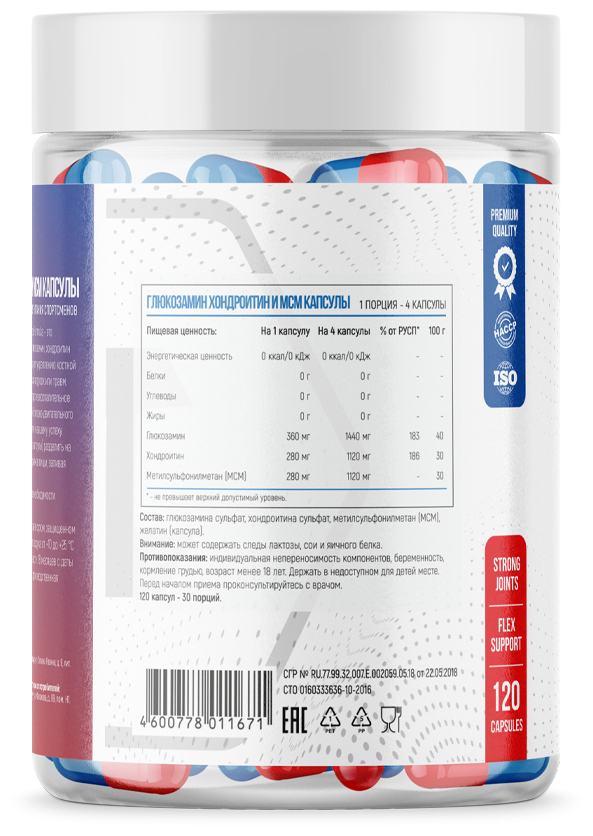 Glucosamine chondroitin MSM - это сбалансированный хондропротектор, разработанный на основе связки корректоров метаболизма косной и хрящевой ткани, а также высокоэффективного противовоспалительного средства. Благодаря биодоступной формуле капсул и отсутствию примесей в составе он быстро усваивается и начинает действовать.