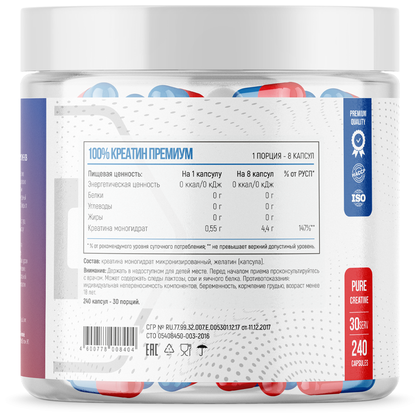 100% Creatine Premium – это удачный симбиоз высококачественного сырья и инновационных методов его обработки. В каждой капсуле вас ожидает 100 % Креатин Моногидрат премиум качества, разработанного концерном VitaJoy. Чтобы он еще лучше абсорбировался и поступал в желудок с минимальными потерями, продукт был микронизирован до рекордных 200 меш. Благодаря этому вы ощущаете выраженный эффект практически сразу после применения. Но и это не все. Продукт максимально безопасен, имеет удобную форму капсул и доступную цену.