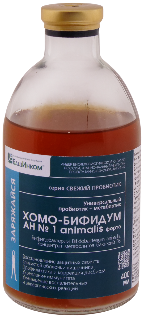 Высокоэффективный универсальный пробиотик с усиленной формулой, обладающий природным иммуностимулирующим действием. Содержит кислотоустойчивый штамм бифидобактерий Bifidobacterium animalis и биологически активные метаболиты транзиторных бактерий Bacillus subtilis – активного антагониста патогенной микрофлоры. Бифидобактерии пробиотика Хомо-бифидум АН № 1 animalis отлично приживаются, восстанавливают колонизационную резистентность и снижают воспалительные процессы слизистой оболочки кишечника, эффективны для профилактики и коррекции дисбиоза, уменьшают аллергические реакции.