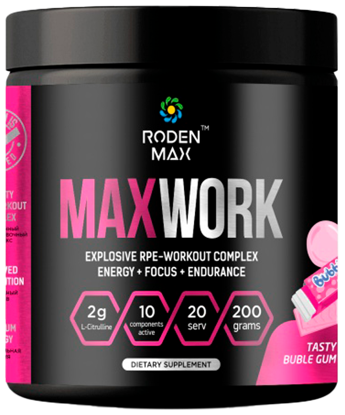 Предтренировочный комплекс от Roden Max разработан для увеличения концентрации, продуктивности, выносливости и силы во время тренировки. Max Work сочетает в себе комплекс аминокислот и тонизирующие компоненты, которые активируют на продуктивную работу не только нервную систему, но и мышечный каркас. Заряжает на эффективную, продуктивную тренировку.