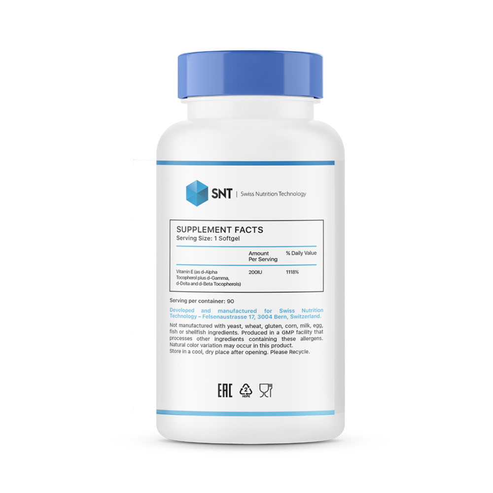 - Натуральный состав: Содержит d-альфа токоферол и смесь токоферолов (d-гамма, d-дельта, d-бета), что делает его эффективным и качественным источником витамина Е.