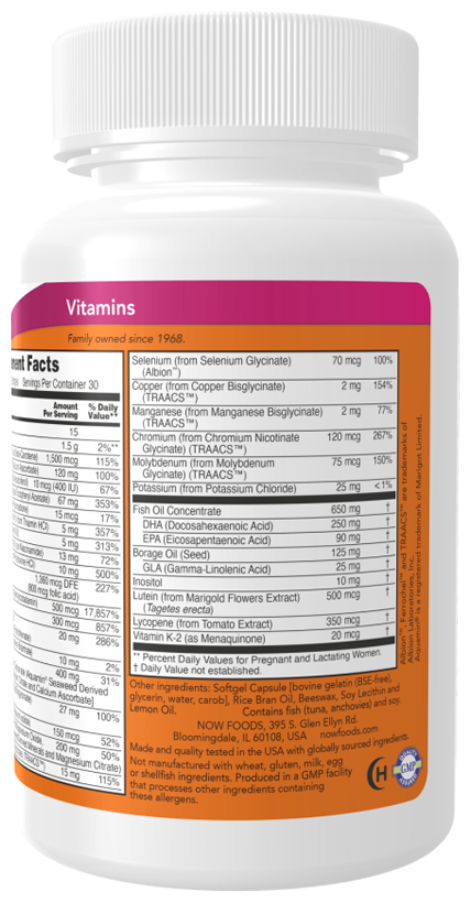 | Омега-3 (из концентрата рыбного жира), карбонат кальция (из морских минералов красных водорослей), цитрат и аскорбат кальция, натуральное масло лимона, соевый лецитин, масло бурого риса, пчелиный воск (Е901), оксид магния, магний из морских минералов красных водорослей, цитрат магния, бисглицинат железа, масло из семян бурачника, аскорбиновая кислота, бисглицинат цинка, d-альфа-токоферола ацетат, хлорид калия, d-пантотенат кальция, бисглицинат меди, никотинамид, холина битартрат, инозит, пиридоксина гидрохлорид, бисглицинат марганца, аминохелат хрома, тиамина гидрохлорид, рибофлавин, бета-каротин, фолиевая кислота, аммония молибдат, лютеин, ликопин (из экстракта томатов), биотин, йодид калия, селенометионин, фитоменадион, метилкобаламин, холекальциферол, желатин, глицерин (Е422), вода, камедь рожкового дерева (Е410) |