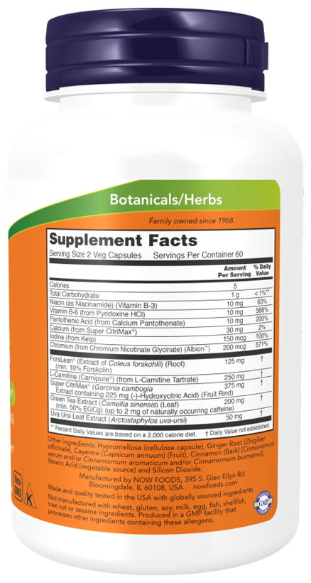Now Diet Support содержит ForsLean, уникальный экстракт колеуса форскохлии, и Super Citrimax, уникальный экстракт-гидроксилимонной кислоты (ГКА), полученный из плодов гарцинии камбоджийской. Доказано, что каждый из этих ингредиентов способствует здоровому усвоению жира, особенно в сочетании со сбалансированной диетой и программой тренировок. L-Карнитин Carnipure, заменимая аминокислота, облегчает перенос жиров в митохондриальную мембрану для использования в выработке клеточной энергии. В дополнение к этой формуле, Now Diet Support включает необходимые питательные вещества и экстракт зеленого чая для поддержки метаболизма.